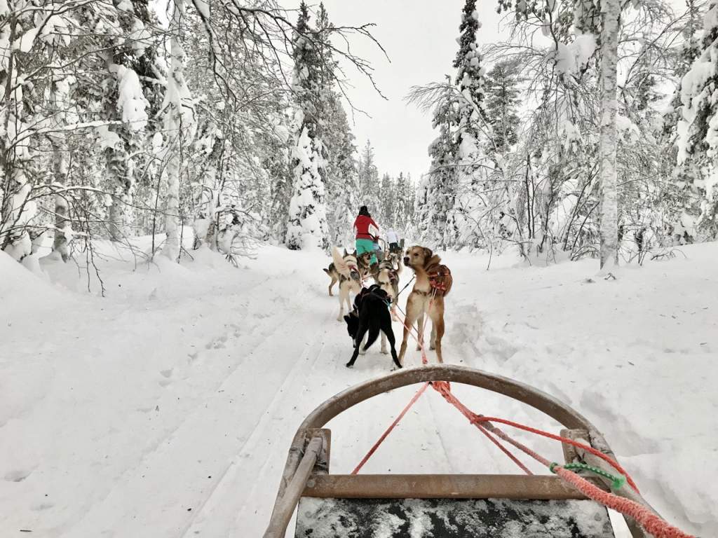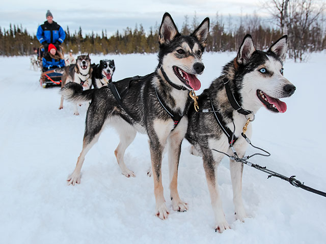 Обід на курорті. Після цього — поїздка на ферму хаскі й катання на упряжках серед засніжених лісів.